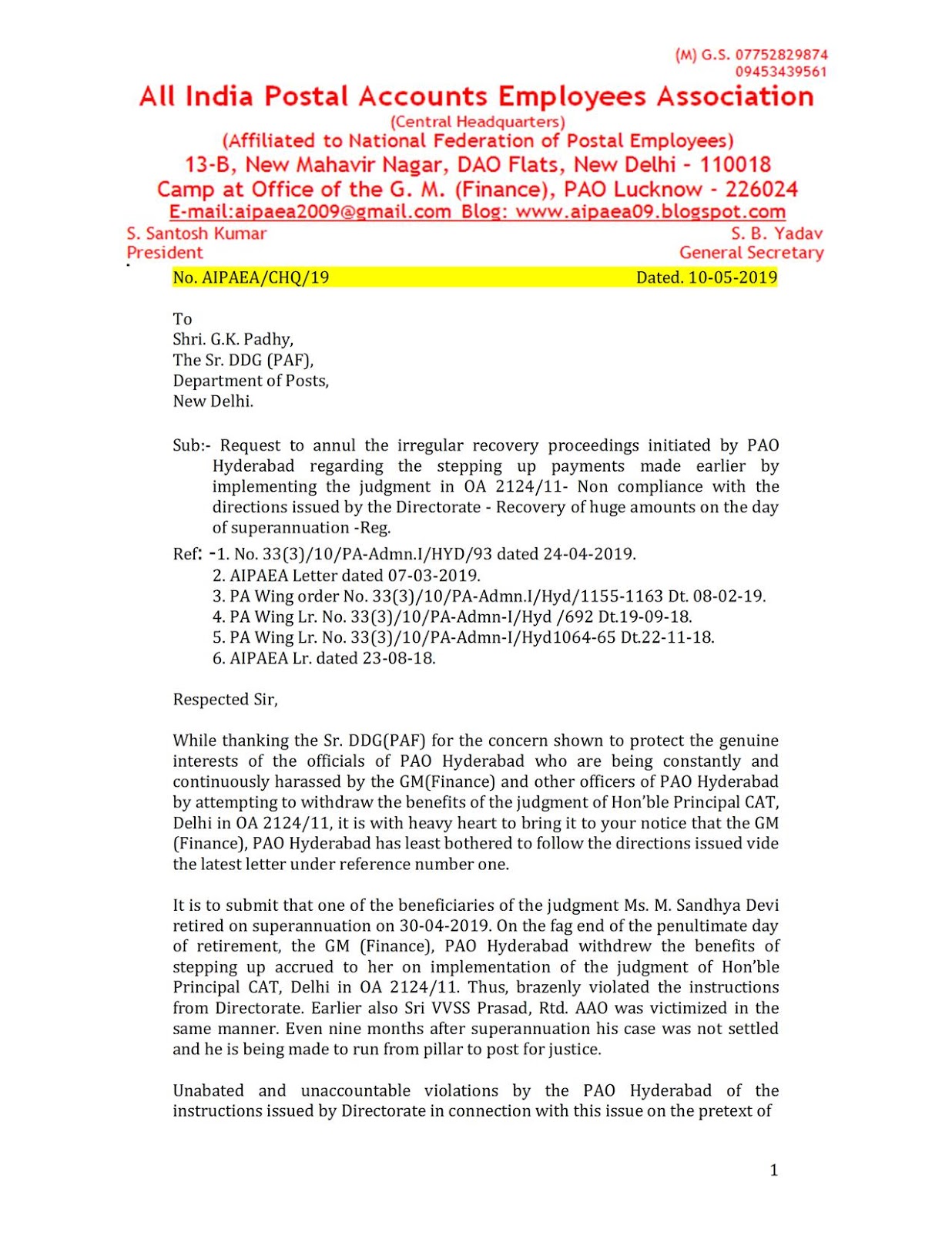 An Organization highlighting principles of unity & struggle for the advancement of Postal Accounts Employees.(M) 09453439561 & 07905282373 All India Postal Accounts Employees Association, CHQ, 13-B, New Mahavir Nagar, Type-IV, DDA Flat, New Delhi – 110 018. (Affiliated to National Federation of Postal Employees.) E-Mail aipaea2009@gmail.com